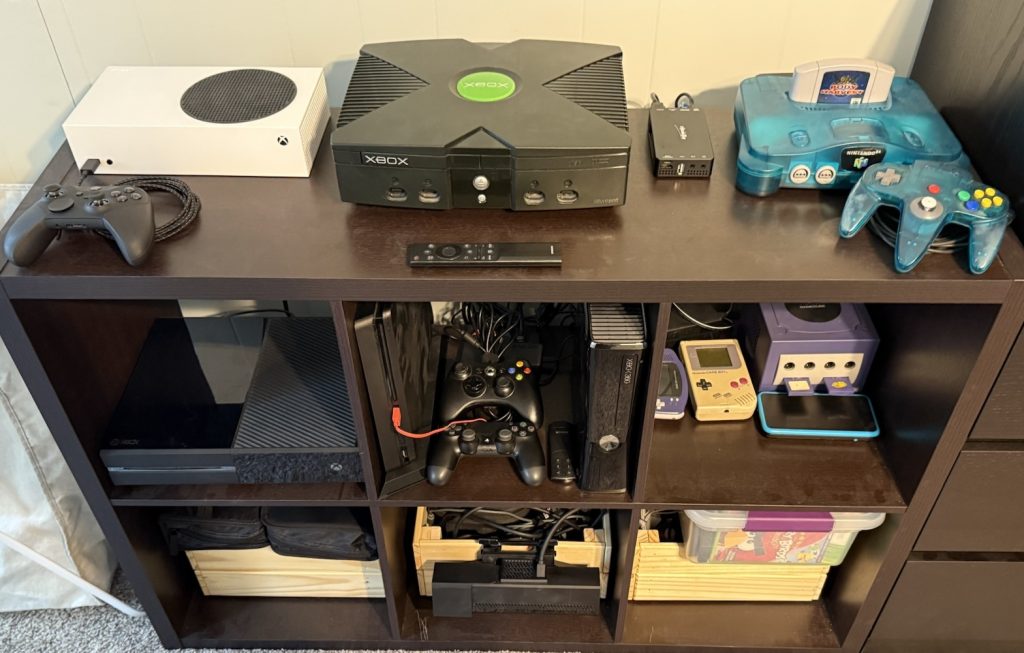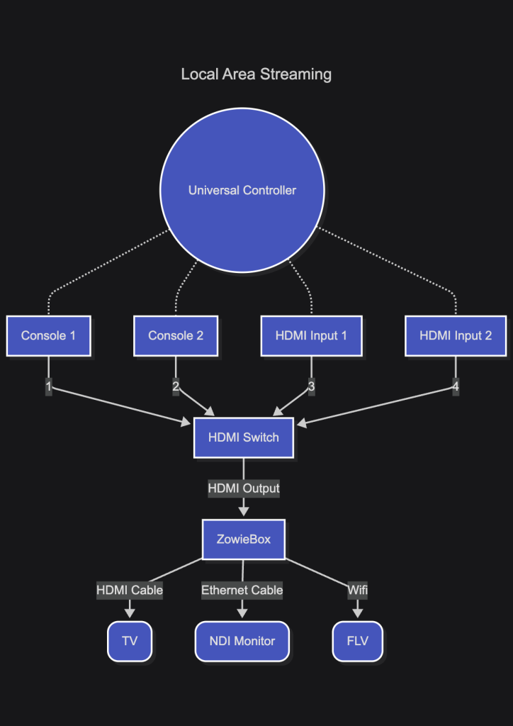 Here is a rough mock up of my console station. A ZowieBox takes in the signals from the HDMI switch. The HDMI switch allows me to set the station up once and press a physical button to change signal source. For now I am picking up the controller from the station if I want to change console. Using the output of the Zowiebox to play on my tv or pick-up from my laptop, home office, or on the treadmill. The best part I can replay retro games directly on the original consoles. The latency is low in both visuals and inputs. Great for games that need split second decisions.